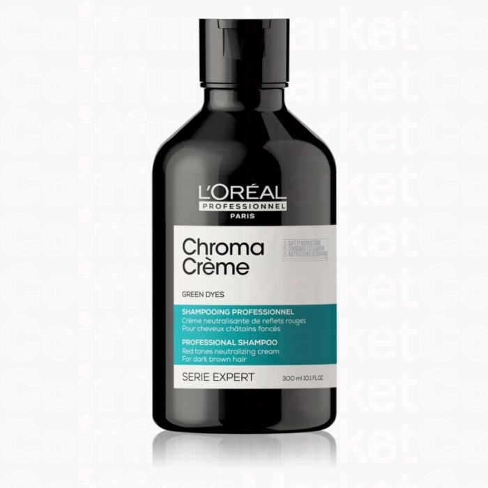 Le Shampooing Crème Vert Chroma de L'Oréal Professionnel Serie Expert neutralise efficacement les reflets rouges indésirables sur cheveux bruns foncés à noirs. Ses pigments verts révèlent des nuances froides et apportent un éclat professionnel à votre chevelure.