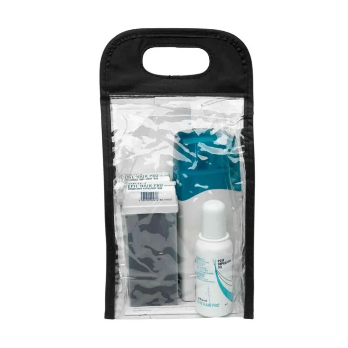 Kit d’épilation comprenant 1 chauffe-cire, 2 cartouches de cire tête large, 1 huile post-épilation et 50 bandes épilatoires.