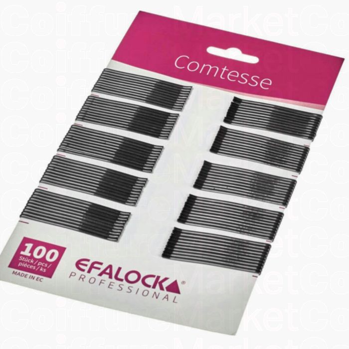 Les pinces à cheveux Efalock Comtesse offrent une fixation professionnelle et fiable. Format 5cm, finition noire élégante, conditionnement pratique de 100 pièces pour un usage intensif en salon.